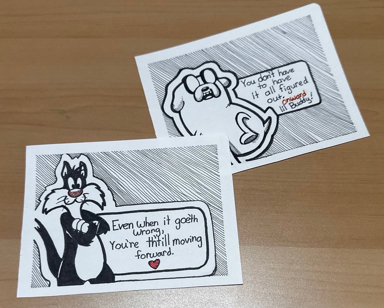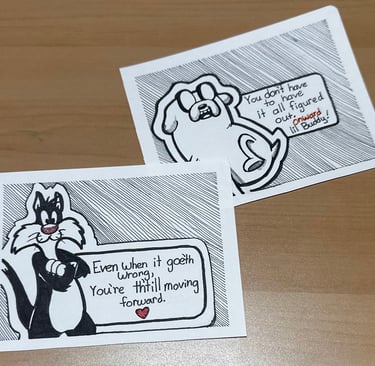 These started as quick doodles, nothing complicated. Just a couple of characters and a few words I kept thinking about while drawing. The kind of reminders that help when things feel messy or unfinished. One is about things going wrong and still moving forward. The other is about not having everything figured out. They came from the same headspace — that quiet middle ground where you’re trying your best, even if the path isn’t clear yet. I like making these smaller drawings because they don’t ask for much. You don’t have to analyze them or read into them too deeply. They’re just there to offer a little reassurance, especially on days when progress feels invisible. If this gives someone a moment of comfort or a reason to keep going, that’s more than enough.