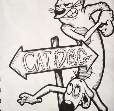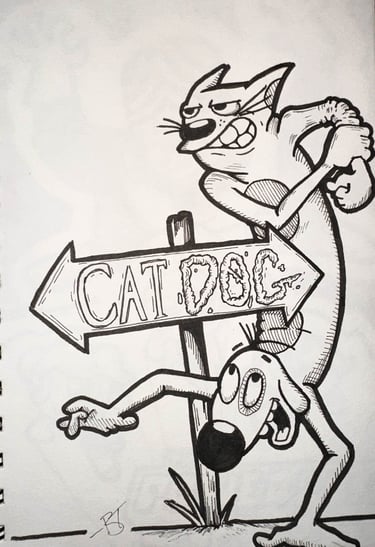 Two halves of the same wild, unpredictable chaos, CatDog stands as a symbol of contrast, partnership, and humor. Their awkward, yet endearing poses capture the balance between opposites and the joyful absurdity of their world.