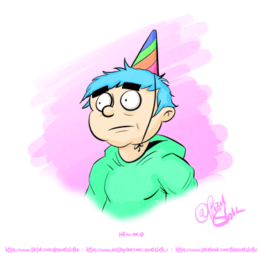 Topped with a rainbow hat and a distant stare, he stands in the middle of the celebration feeling slightly out of sync. Bright colors try to insist on joy, but his expression tells a softer truth—sometimes the party is loud, and you’re quietly elsewhere. A small, honest moment of humor and melancholy wrapped in confetti.