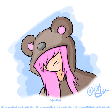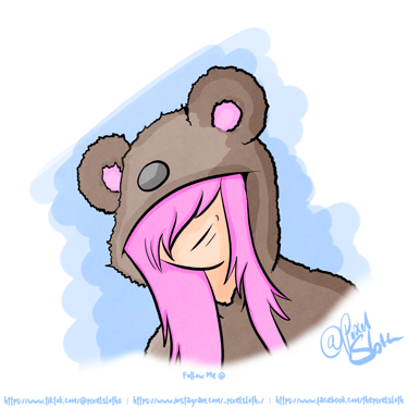 Wrapped in a soft bear hoodie, she drifts between past and present, a quiet spark of color against the calm. Her pink hair falls like a whispered memory, turning simplicity into something gently magical.