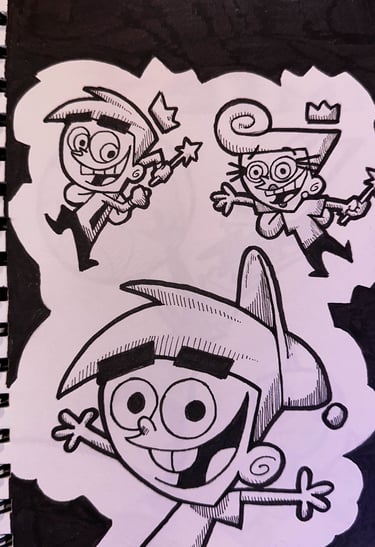 Magic, mischief, and a little bit of chaos — Timmy and his fairy companions represent the boundless imagination and whimsical trouble that make childhood so memorable. This piece highlights their playful energy against a bold black background.