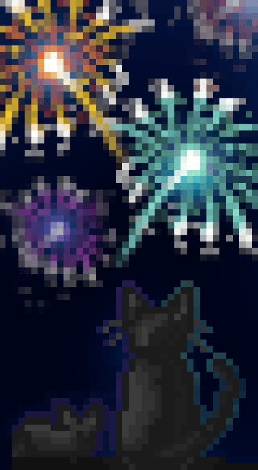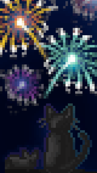 Simply a cat and her kitten watching the fireworks on a night sky.